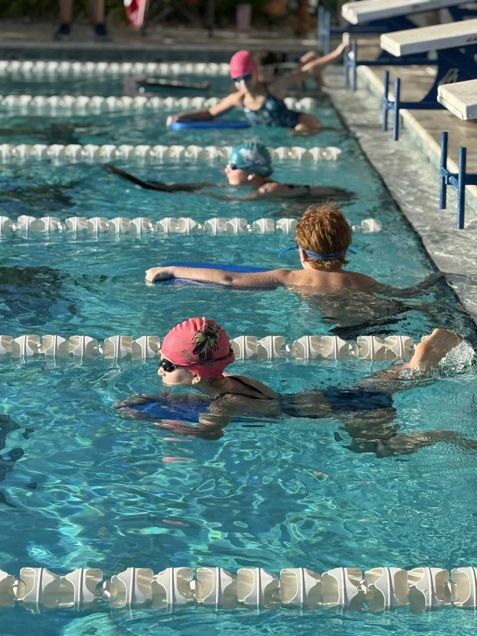 Coaches & volunteers guide swimmers through warm-ups and races
